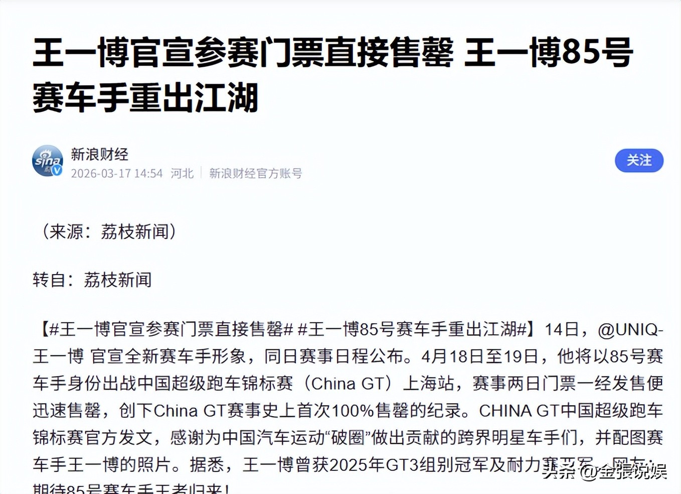 2026年3月,他正式宣告以85号赛车手身份投身超级跑车锦标赛。