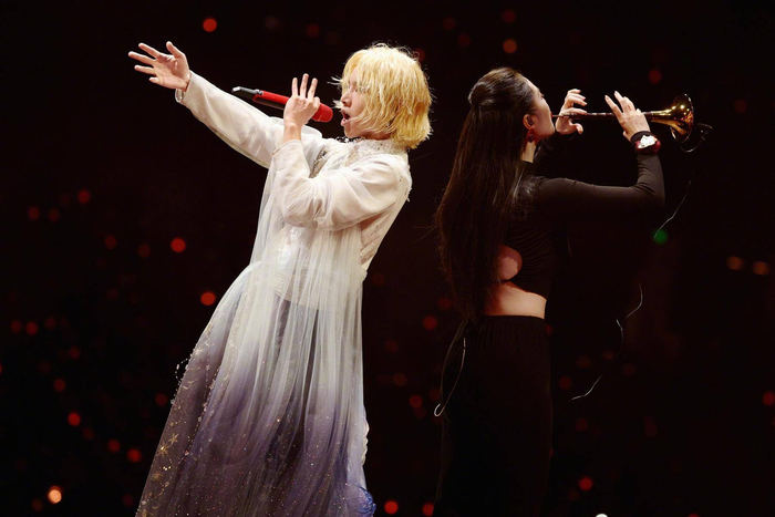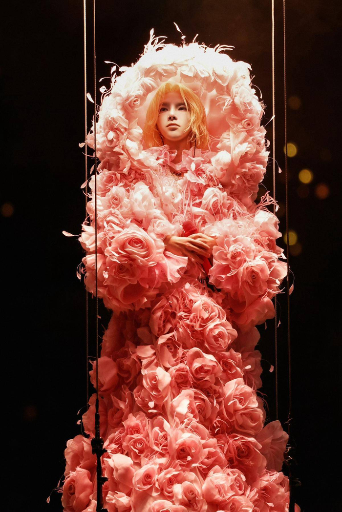 演唱会上,华晨宇身着以花朵为灵感的服装,从12米悬空舞台惊艳出场。《向阳而生》《异类》《拆弹专家》等歌曲悉数登场,现场歌迷进入音乐狂欢模式。《七重人格》开启了演唱会的国风乐章,10位民乐家登台演奏唢呐、箫、琵琶、古筝、巴乌等传统乐器。值得一提的是,华晨宇与民乐演奏家佩戴广绣胸针出场,让更多人领略这一非遗技艺的独特魅力。唱到《永不熄灭的火焰》这首歌时,现场出现了绚烂的烟花,赢得歌迷阵阵欢呼。
