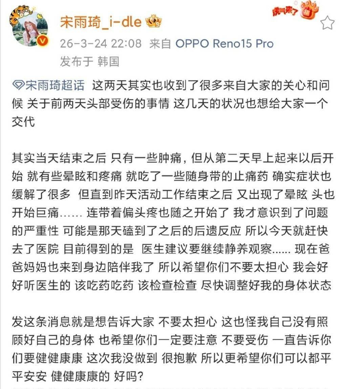 直到3月24日,症状加剧的宋雨琦才前往医院就诊。 医生诊断为头部撞击引发的后遗反应,明确要求她必须暂停所有工作,静养观察。 当晚,她在个人微博发文回应,坦言撞伤后出现了严重的头痛和晕眩,并已遵医嘱开始静养。 她向粉丝致歉:“让你们担心失望对不起”,并呼吁大家“一定要平安健康,不要受伤”。