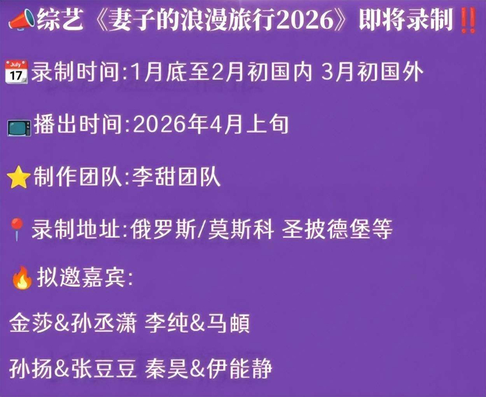 芒果台这回真的是让人大跌眼镜,消失了许久的《妻子的浪漫旅行》终于回归了,而且还是2026年全新一季!更让人惊讶的是,这一季不仅录制了,还准备了个新鲜的大招——目的地竟然定在了俄罗斯!网传消息说,这次录制的模式也有变化,打破了以往的惯例,显得相当与众不同。过去,我们总是在热带风情的度假地见到他们的身影,没想到这次要在俄国的冰雪天地里体验浪漫,真的是一个让人期待的转折。