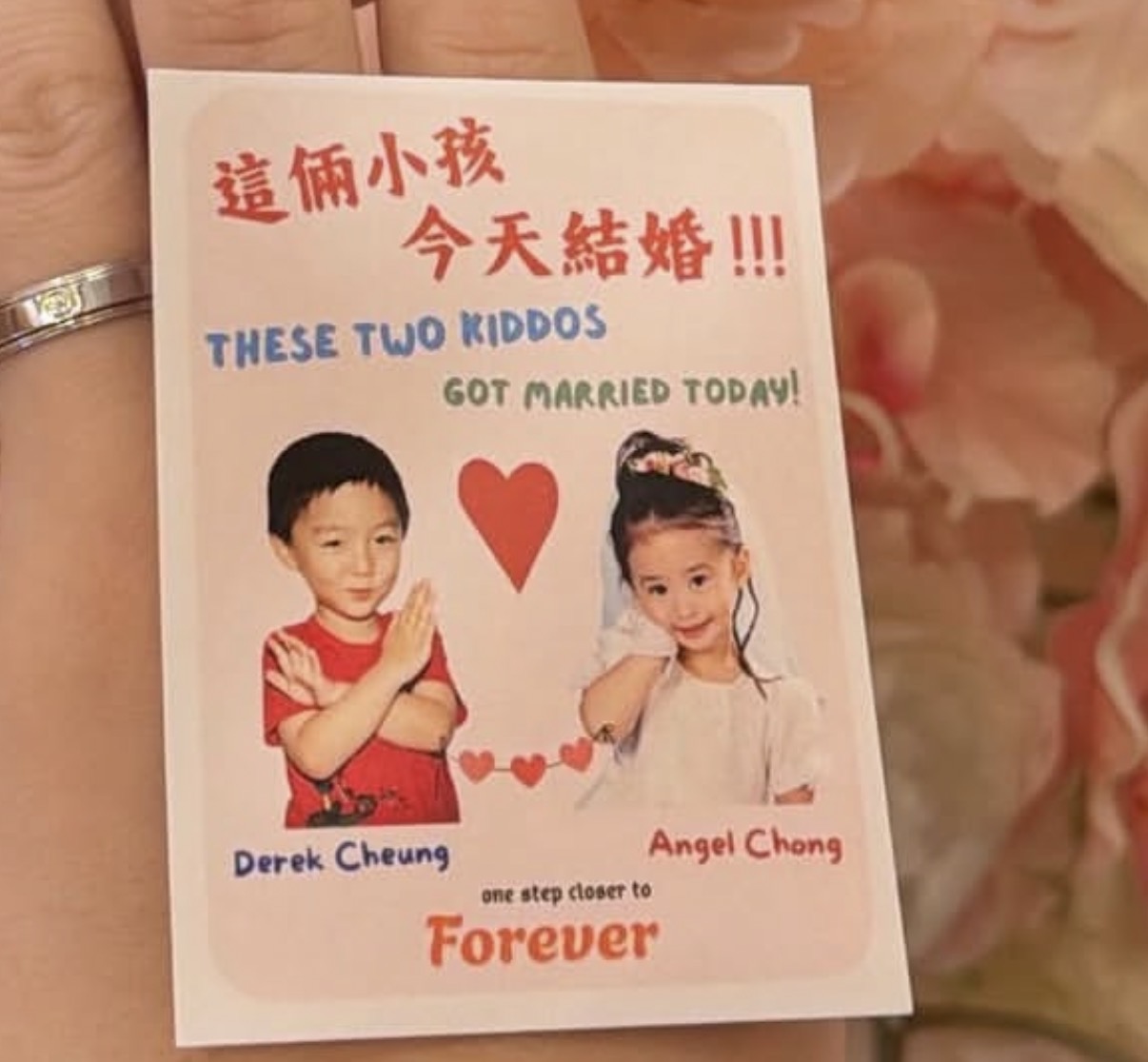 当然两位新人要晒的绝非钻戒、名表,只是想告知大家,两人已经结婚,手上都戴上了结婚戒指。除了结婚戒指之外,在钟培生的手背上,还有一张两人儿时头像的合照,照片中是钟培生与庄雅婷小时候的可爱照,还用了三颗心串在一起,说明心心相印,照片最上方写着“这俩小孩今天结婚!!!”,以此昭告天下。
