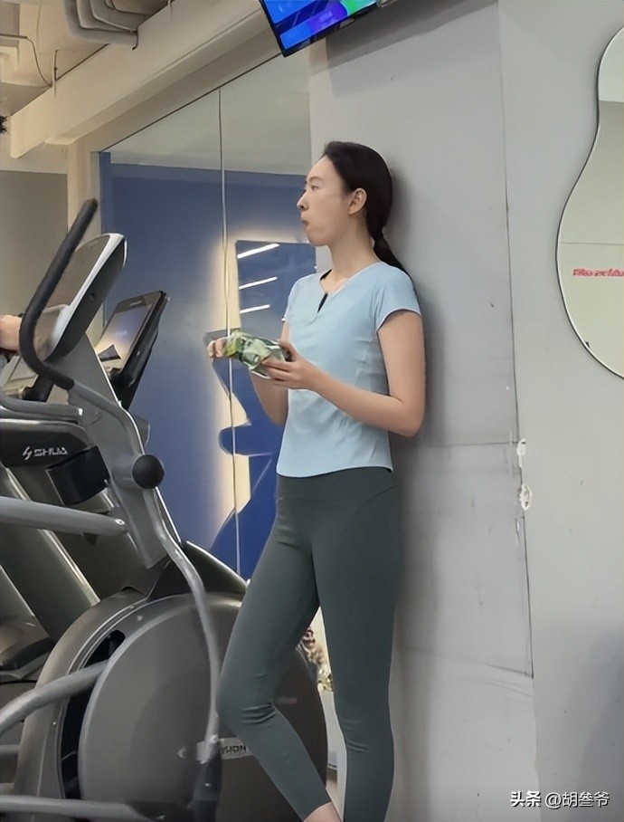 照片里她穿蓝色短袖和灰色瑜伽裤,身材消瘦,双腿纤细,状态特别好。