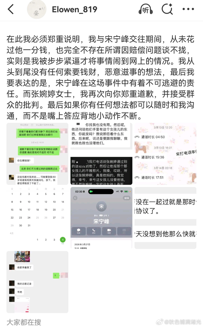Q女士在微博发文回应关于自己与宋宁峰、张婉婷的风波,她说:在此我必须郑重说明,我与宋宁峰交往期间,从未花过他一分钱,也完全不存在所谓因赔偿问题谈不拢,实则是我被步步紧逼才将事情闹到网上的情况。我从头到尾没有任何索要钱财,恶意滋事的想法,最后我要表达的是,宋宁峰在这场事件中有着不可逃避的责任。