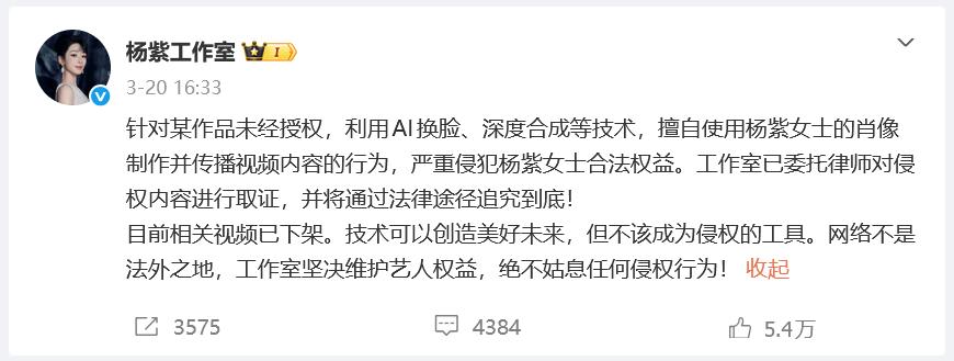 当天,杨紫工作室发文:针对某作品未经授权,利用AI换脸、深度合成等技术,擅自使用杨紫女士的肖像制作并传播视频内容的行为,严重侵犯杨紫女士合法权益。工作室已委托律师对侵权内容进行取证,并将通过法律途径追究到底!